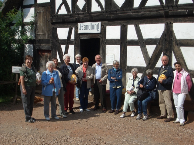 Nach Mittagessen unter den alten Bäumen des Parks begann unsere Führung zu dem Thema „Wir Rheinländer“. Ein wohl extra für diese Ausstellung gebautes Haus in der Art einer Straße führte uns entlang der rheinischen Geschichte. Auf der einen Straßenseite war hinter den Fen-stern die „Obrigkeit“, auf der anderen Seite das „Bürgertum“ dargestellt. Begonnen wurde mit Napoleon, der für unsere Gegend bis auf den heutigen Tag bestimmend war. Die Ausstellung endete mit Darstellungen des Wiederaufbaus nach dem zweiten Weltkrieg.