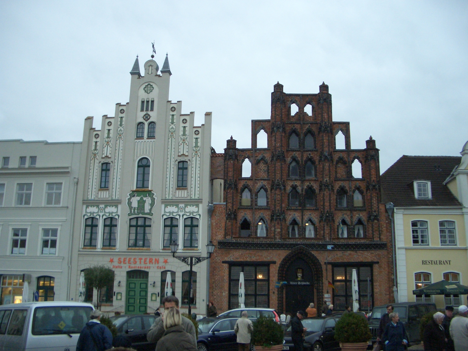 Alle hatten sich entschlossen, zusätzlich eine Fahrt nach Wismar zu buchen. Wismar gehört mit seinem gesamten Stadtkern zum Weltkulturerbe. Hier ist das Bild einer mittelalterlichen Stadt noch vollständig erhalten. Weithin sichtbar auch für ankommende Schiffe, der Turm der Marienkirche. Da sie im 2. Weltkrieg zerstört wurde, hat man sie vor einigen Jahren bis auf den Turm abgerissen. Um sich ein Bild von der Größe und dem Grundriss dieser Kirche machen zu können, wurden die Fundamente in Backstein etwa 80 cm über dem Boden nachgebaut. Mitten drin steht der alte Brennofen, in dem die Steine zur Zeit des Baus der Kirche gebrannt wurden.