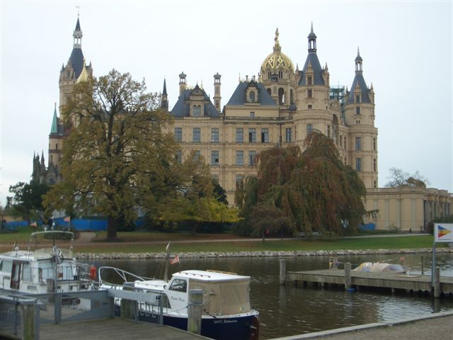 Das Schloss in Schwerin ist 1871 gebaut. An ihm sind alle Baustile, die bis dahin bekannt waren, verwandt worden. Beachtenswert ist der Garten. Die Innenausstattung ist präch-tig. Das, was wie Stuck oder Marmor aussieht, ist eine in aufwendiger Technik hergestellte Imitation aus verkleisterten Papier- und Pappschnitzeln.