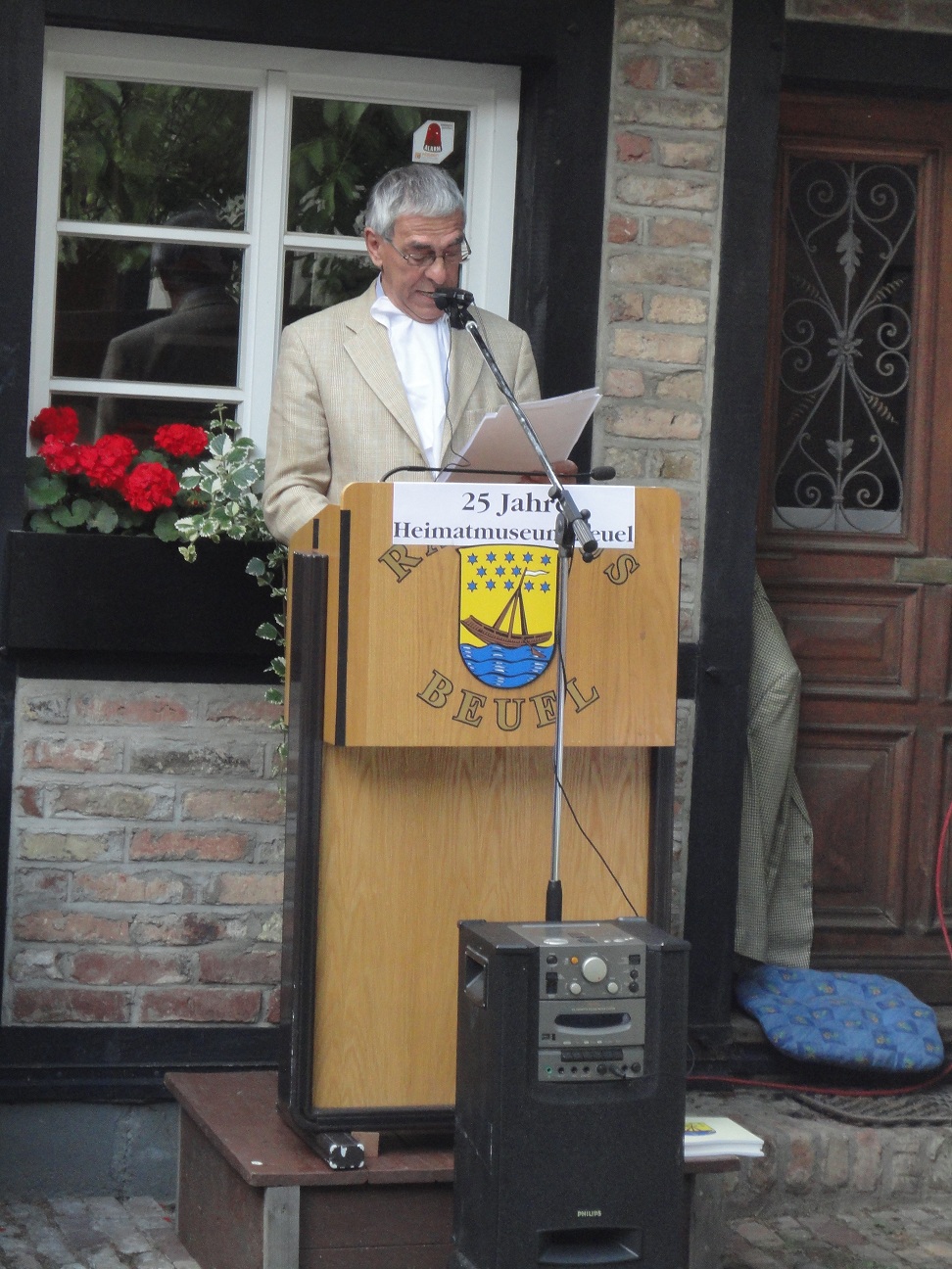 Von allen als Höhepunkt des Tages empfunden, wurde die Laudatio von Dr. Manfred van Rey, der in die Rolle des ersten Bürgermeisters der Samtgemeinde Vilich, Leonhard Stroof, geschlüpft war. In gekonnt rheinischem Dialekt ließ er die Zeit von 1809 bis heute Revue passieren. Sein Schwerpunkt lag natürlich in den Jahren ab 1986, dem Grün-dungsjahr des Museums.