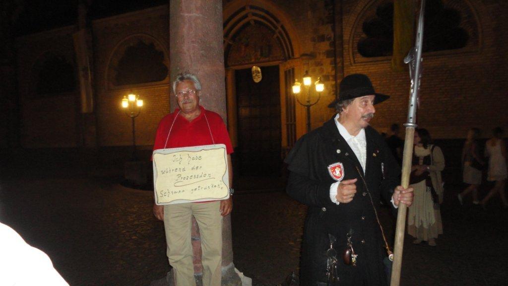 Hier endete der vergnügliche und informative Gang mit dem Nachtwächter. Doch zuvor wurde einer aus der Gruppe an den Pranger vor dem Münster gestellt. Er hatte ein Schild umhängen, auf dem sein Vergehen bemerkt war: Ich habe während der Prozession Schnaps getrunken.