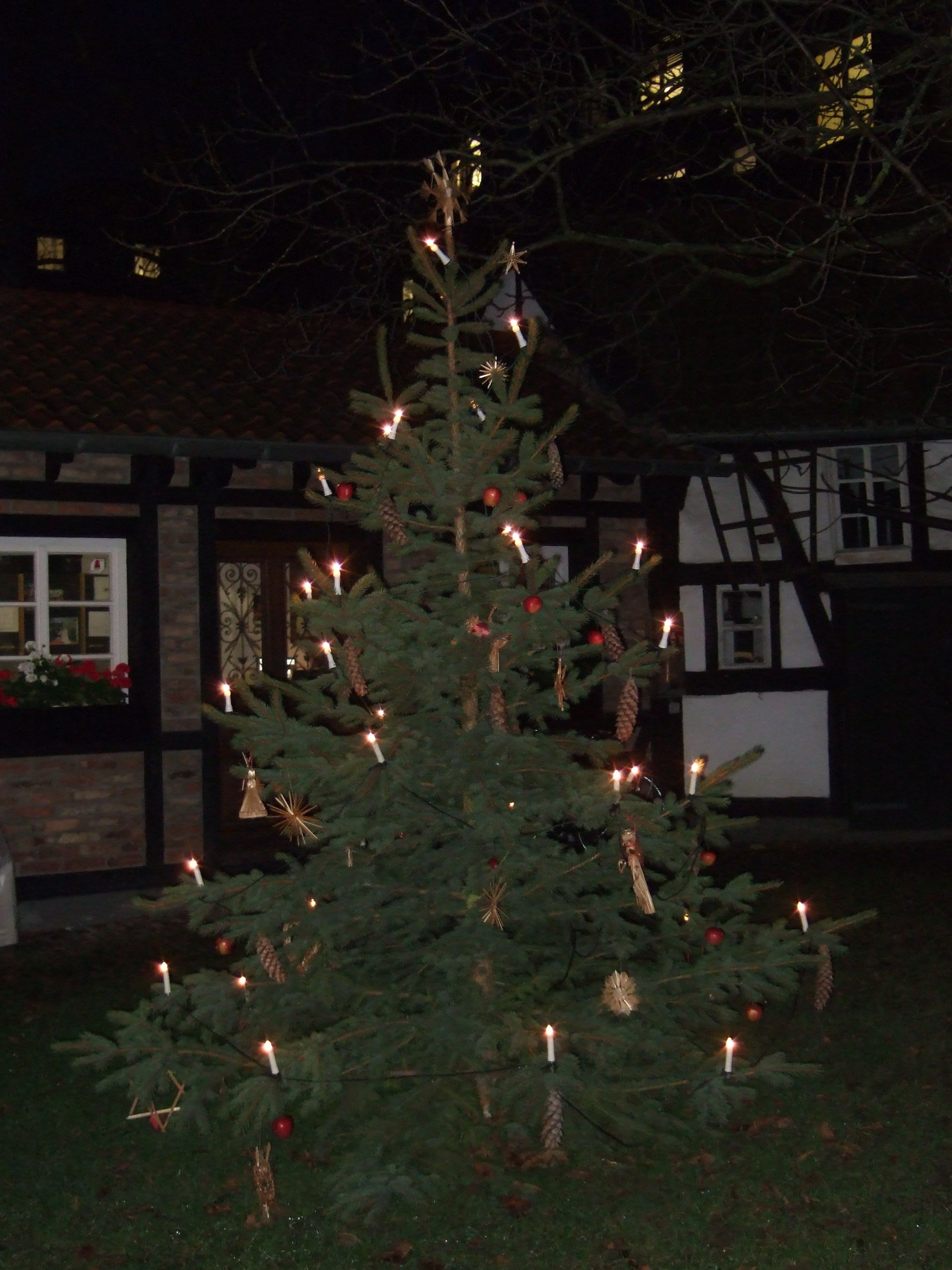 Im Hof des Heimatmuseums Beuel steht der Weihnachtsbaum. Seit dem 1. Adventssonntag, dem Tag, an dem er innerhalb der Veranstaltung „Offenes Singen“ aufgestellt wurde, erfreut er die Besucher.