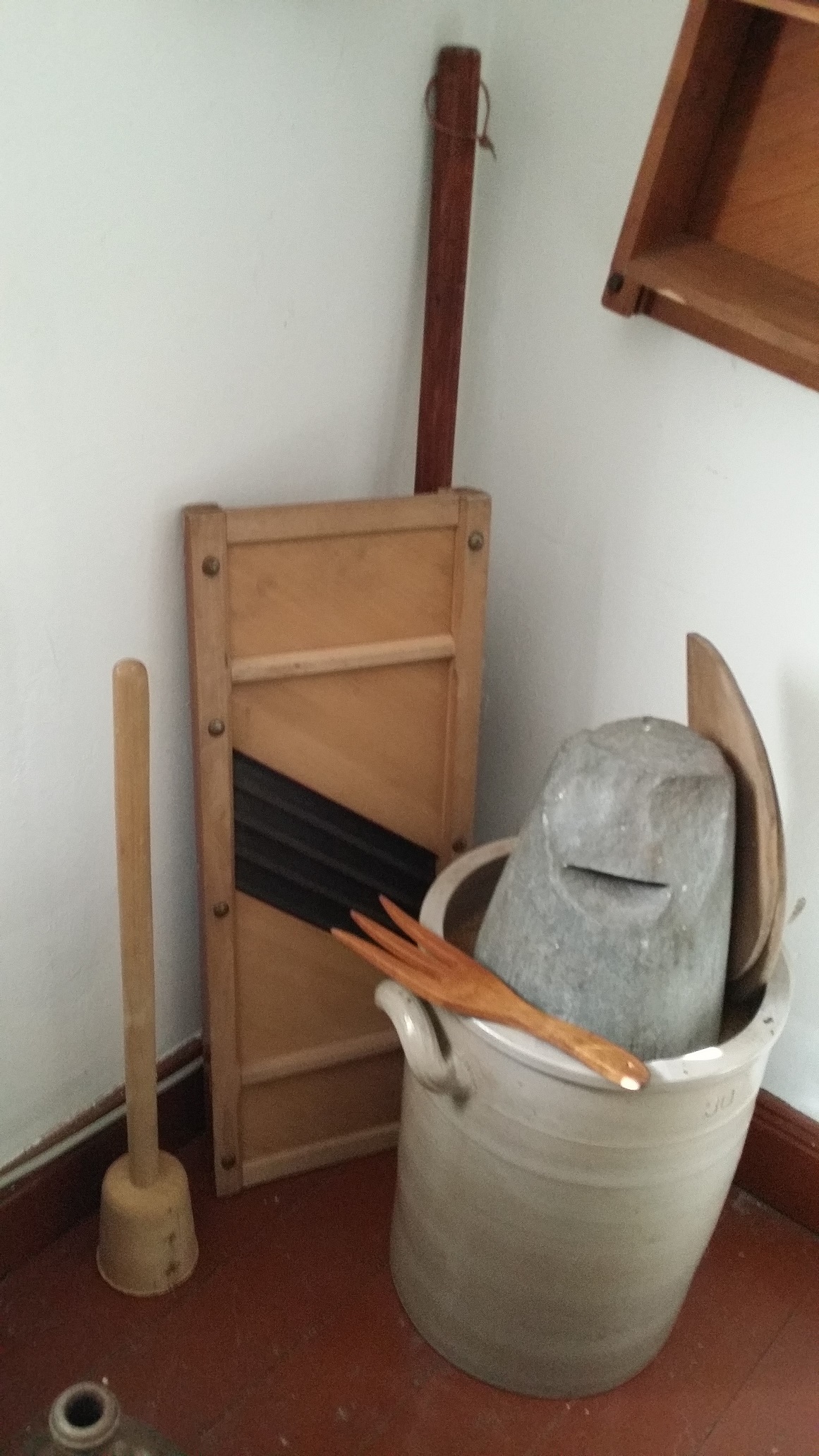 In der Vorratsküche des Museums steht ein altes Sauerkrautfass mit einem dicken Stein zum Beschweren des Krauts. Auch Krauthobel und Stampfer sind zu sehen. Es ist aber auch ein moderner Topf vorhanden, der sich für die eigene Sauerkrautherstellung perfekt eignet.